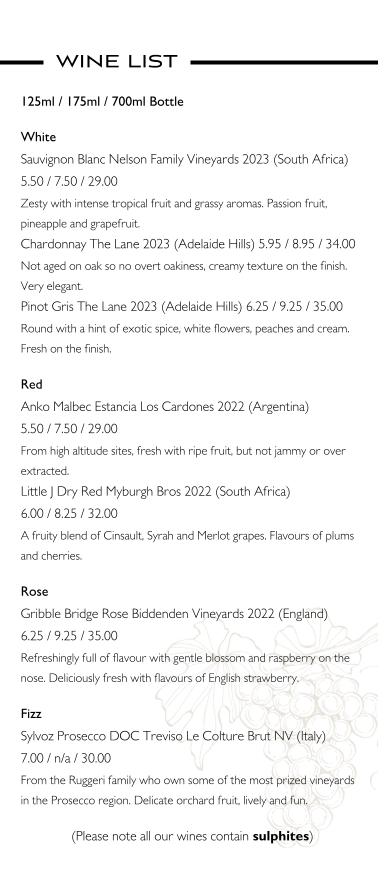 Superb coffee supplied by Alfie & Co. served hot or extra hot. Decaf coffee, semi-skimmed and oat milk available.